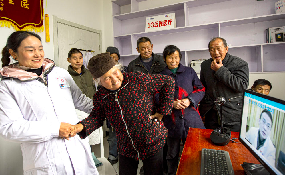 安徽金寨县大湾村村民方临芳(前右)指着自己身体疼痛的部位,在村医袁玲(前左)的帮助下向通过5G网络远程医疗会诊的专家讲述病情。“互联网+医疗”让村民在“家门口”也能享受专家诊疗(2020年12月3日摄)。
