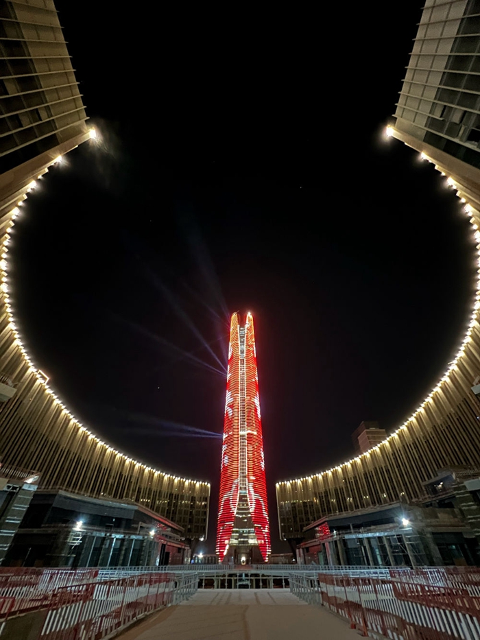 2024年2月9日,埃及开罗以东建设中的埃及新行政首都中央商务区项目上演灯光秀,迎接龙年春节。新华社发(黎炳宏摄)